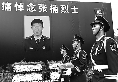 在骨灰安放仪式上,武警战士手捧骨灰盒从张楠烈士遗像前走过。新华社发(傅新春摄)