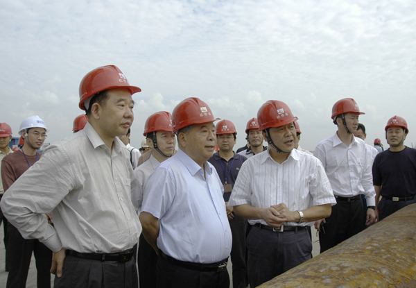 2006年10月8日,原中共中央政治局常委、中央书记处书记、中纪委书记尉健行来到杭州湾跨海大桥工地视察。尉健行详细询问了大桥建设的特点与难点,并与在场员工一一握手,并合影留念。