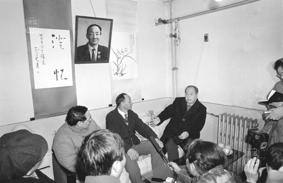1994年1月27日,全国总工会主席尉健行(右一)等在荣获全国“五一”劳动奖章的采煤工人荣春利(右二)家中了解矿工的生活和工作情况。