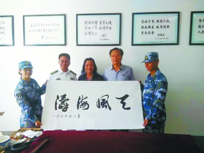 今年5月,卢明作为唯一的书法家代表随省拥军慰问团到南海三沙市慰问部队(左图,中为卢明),万里海疆上三军指战员的昂扬斗志,激发了其创作热情。他说,如果能为爱国拥军的事业坦途当好一块铺路石,便心满意足了。(本报记者 树红霞)