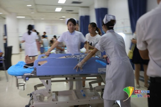 图片为距离事发地点最近的医院天津泰达医院,实拍医院救护现场。图片来源:中国青年网