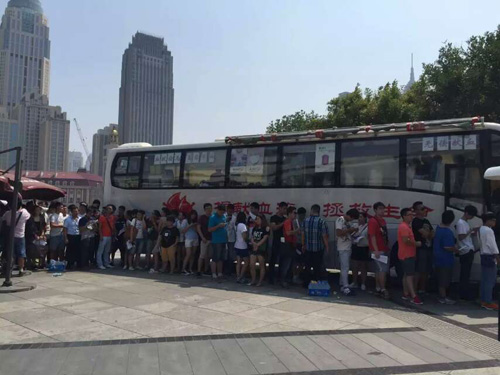 图片为13日,天津开设了八个献血点,一上午前来参加献血的人员爆满。在天津火车站,前来献血的市民在烈日下要排队3个小时以上,却依然热情饱满。附近商铺拿出了遮阳伞和冰饮大桶,主动免费送到前来排队献血的市民手中。负责量血压的大夫下午2点还没顾上吃午饭,他总说“再等一会儿”。下午赶过来的市民被告知只能明后天再来了,因为队伍实在太长,一上午就有5000群众前来献血。(中工网记者 秦笑语摄)