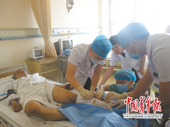 8月14日上午,天津泰达医院医务人员在为获救的19岁消防战士周倜进行清创。本报记者 张国/摄