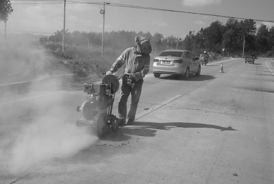 叶德财用切割机将路面坑槽的边缘切割整齐。