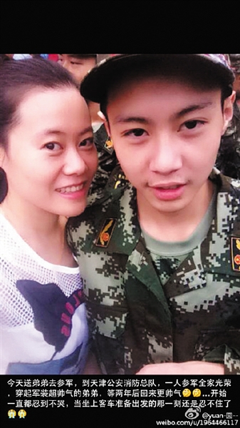 2天后的9月18日,袁媛亲手为弟弟袁海戴上了大红花,唯恐红花不正,歪着头左右调整。“弟弟穿起军装,超帅。”