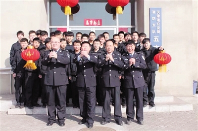 2014年过年,当时五大队的31位消防员在大队办公楼前合影。家属供图