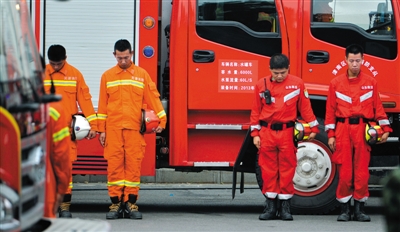 消防战士在爆炸事故现场为事故中的遇难者默哀。图/CFP