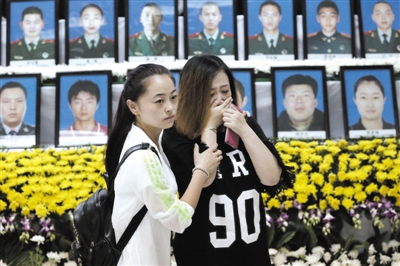 昨日,天津市公安消防局开发支队设立吊唁灵堂,两位女孩前来悼念。