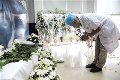 昨日,康翠社区,一名医护人员手拿白菊花向遇难者鞠躬悼念。