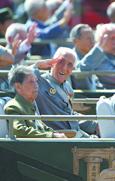 ▲参加受阅的抗战老兵敬礼。 新华社记者 王颂摄