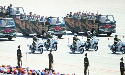 ▲摩托车礼宾护卫抗战老兵乘车方队。 新华社记者 陈晔华摄
