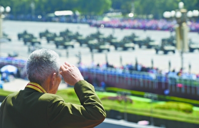 ▲一位老兵在天安门城楼上观礼。新华社记者 赵鹏摄