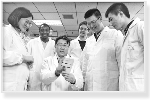 高福院士(坐姿者)与研究团队成员在实验室讨论实验结果。本报记者 佘惠敏摄