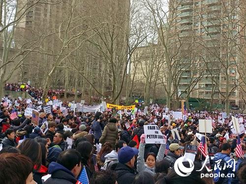 人民网纽约2月20日电 今天中午,纽约数万华人在布鲁克林卡德曼广场公园举行盛大示威集会,声援警官梁彼得,维护华人权益。这一示威活动得到全美40多个城市华人的热烈响应,示威抗议浪潮席卷全美。主办者称,从美东到美西,预计百万人加入示威队伍。参加示威的城市和人数,均史无前例。