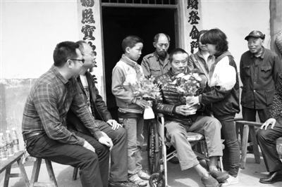 4月7日,在广安区龙台镇小桥村杨承弟家中,他的学生正在给他赠送鲜花,祝他早日康复。