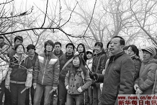 ▲李保国(前)带领学生实习(2009年11月29日摄)。 新华社发