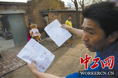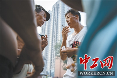 图右:8月11日早上,一位农民工正与工头讨论今天的工作和工资。