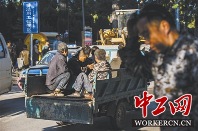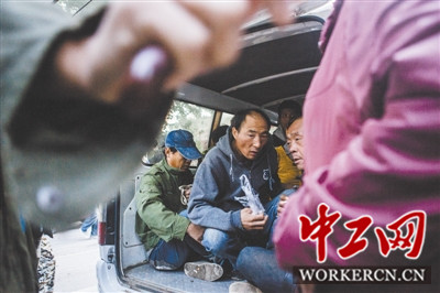 凌晨5时左右,天已大亮,负责接送农民工的吕亮将面包车停好后,扯开嗓子朝人群大喊:“小工,小工,一天120元。”几位睡在远处停车场里的农民工被嘈杂的人群吵醒了,他们从地上爬起,伸了伸懒腰,便麻利地收拾好铺盖卷,朝劳务市场走去。随着车辆和人群的不断增加,本就不宽的马路开始变得拥挤,开往北京方向的绿色公交车不停地鸣笛,但拥堵的人群丝毫没有要躲闪的意思。