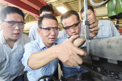9月9日下午,记者来到陕西汽车控股集团有限责任公司汽车装备制造厂装备车间时,席小军手里正拿着一件汽车模具零件给徒弟讲解。