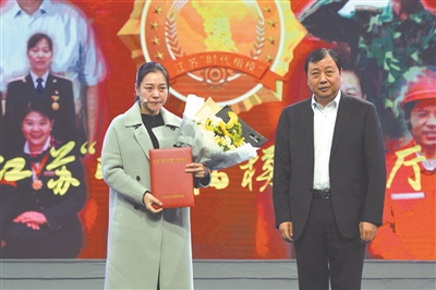 图为王华同志妻子王翔从江苏“时代楷模”吴协恩同志手中接过江苏“时代楷模”荣誉证书。 新华报业视觉中心记者 万程鹏摄