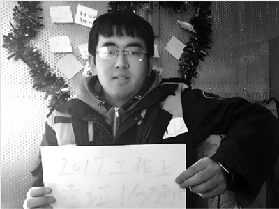 2017年的第一缕阳光照进呼张铁路上的大机驾驶操作室,大机人在里面贴上了各自的新年愿望,定下一个个。图为呼和浩特铁路局工务机械段线路捣固一车间二工班青工王昱浩在展示自己的新年愿望。朱杰 摄