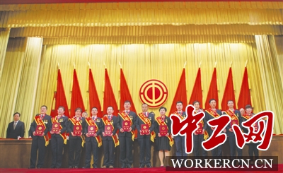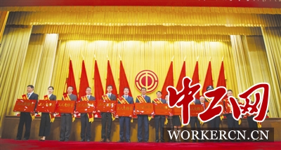 4月27日上午,全国工人先锋号获奖集体代表上台领奖后合影。 (中工网记者 杨登峰 吴凡 王伟伟 摄影报道)