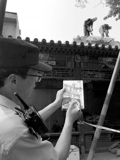 这个地方有什么特别的吗?“我管这片五年多了,这儿一直是个老大难问题。它是个临建,原来是仓库,后来变成咖啡馆,着过火。各方面都不合格,来回告知整改,来回反复。这回终于拆了,太不容易了。值得记录一下!”李劲松说。他从城管队员拍的5张照片里选出一张,照着画了一幅画。