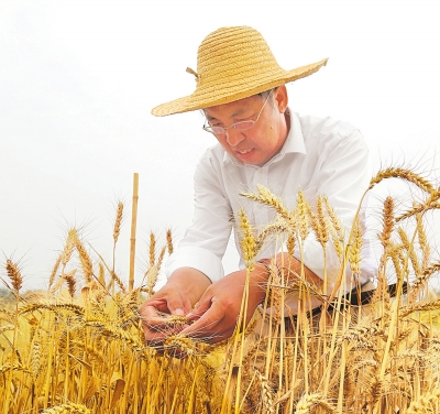 茹振钢在麦田里鉴别麦子特性(本报资料图片)