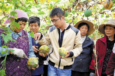 10月10日,黄灿(中)在指导农民了解瓜蒌品质。