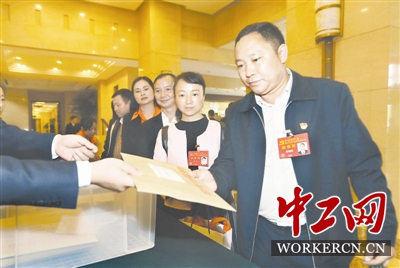 图为10月15日,党的十九大代表、兖矿贵州能化发耳煤业有限公司综采二区党支部书记、区长朱加贤(右一)在驻地领取相关资料。中工网记者 杨登峰 摄
