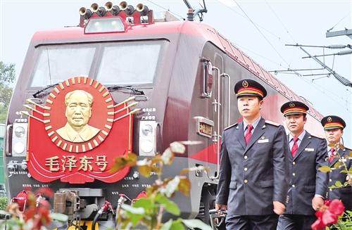 党的十九大代表、北京铁路局丰台机务段“毛泽东号”机车组司机长刘钰峰(前)十几年如一日安全驾驶机车,创造了安全行驶1000万公里的纪录。杨宝森摄