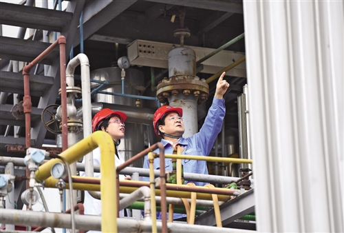 党的十九大代表、河北廊坊新奥集团技术委员会副主席李金来(右一)在煤基低碳能源国家重点实验室试验基地,就煤炭清洁高效利用技术产业化过程中的难点进行科技攻关,致力于将煤由“黑”变“白”,多项科研成果获得广泛推广。 本报记者 翟天雪摄