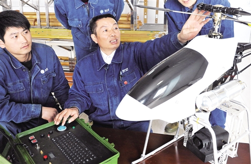 在野外巡线岗位上已经坚守了35年的党的十九大代表、国网安徽省宿州供电公司输电运检室带电作业班副班长许启金(中)正在给工友讲解无人飞机巡线技术。 冯厚慈摄