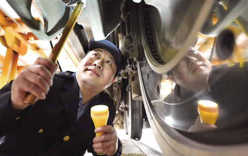 党的十九大代表、南昌铁路局向塘机务段司机郭学飞在给列车“体检”。他熟稔机车平稳操纵技艺,用精湛行车技艺服务旅客安全出行。 鲍赣生摄