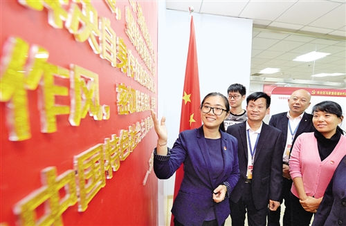 党的十九大代表、北京市丰台区马家堡街道时代风帆楼宇党委副书记韩青(左一)创建的“六微”党建模式在非公领域落地生根。 本报记者 高兴贵摄