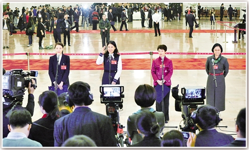 10月18日,中国共产党第十九次全国代表大会在北京人民大会堂开幕。这是开幕会前,吴敏霞、杜玉涛、蒙曼、卢丽安代表(自左至右)接受采访。新华社记者 殷刚摄