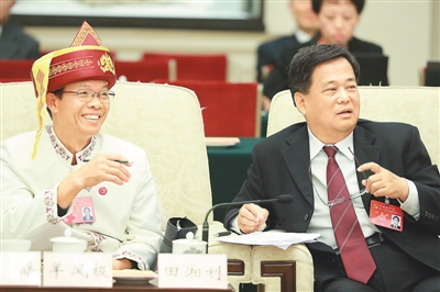 十九大代表、海南省白沙黎族自治县打安镇田表村党支部书记羊风极(左)和十九大代表、三沙市委书记田湘利参加讨论。中新社记者 盛佳鹏摄