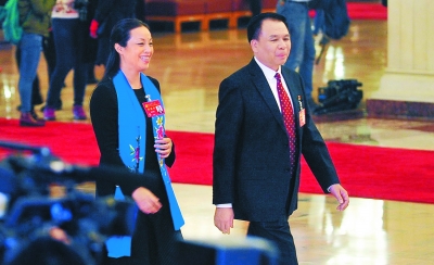 北京代表贾立群(右)走上党代表通道接受采访。本报记者 戴冰摄