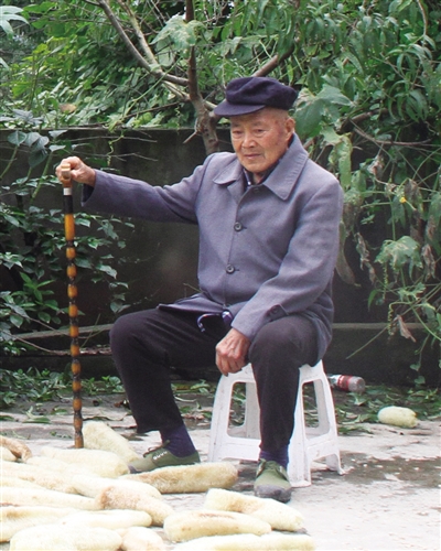 在到达高古村便民服务中心前,记者提前来到了薛于恒老人的家中,薛老先生的老伴已经出门劳作,薛老先生杵着拐杖在农家小院中晾晒着当季的丝瓜和黄豆。