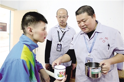 张通全说,水杯中倒多少水,其实也有讲究。因为很多残疾老年人行动不便,一旦水倒满,他们喝着就会洒在衣服上,天气一冷就容易感冒。因此,他每次倒水时,都只倒大半杯,等老人喝完了,再给他添水。由于每层楼居住的人群不一样,因此他们倒水时,还会协助老人,比如对残疾老人、智力有障碍的老人来说,根本无法正常饮水。因此,张通全要把水一杯杯喂到他们嘴里或用勺子喂进嘴里。为了保证这些老人喝水不会被烫伤,他每次都要反复用手背触碰老人喝水的杯子测试水温。