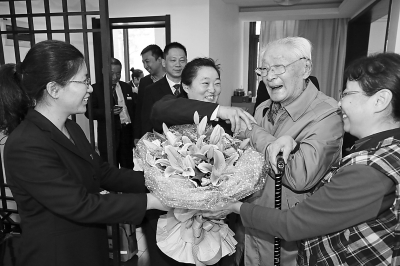昨天,宏达出租车爱心车队的10多名志愿者来到105岁的老红军、原南京邮电学院党委书记兼院长秦华礼家中看望慰问,感谢秦老等革命先辈用鲜血和生命换来我们今天的美好生活。(本报记者 徐琦摄)