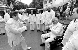 各练各的好孤单嘛!两位老人一合计,干脆结为师徒,带领院内100多名老人打太极、做养生操。