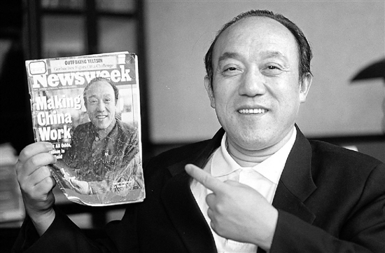 2013年11月,鲁冠球向新华社记者展示一本印有自己照片的《新闻周刊》(1990年4月2日,鲁冠球成为美国《新闻周刊》封面人物)。 新华社 资料照片