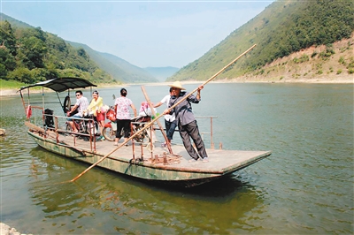 韩文新撑船送乡亲们过河 记者胡毅 通讯员刘颖 摄