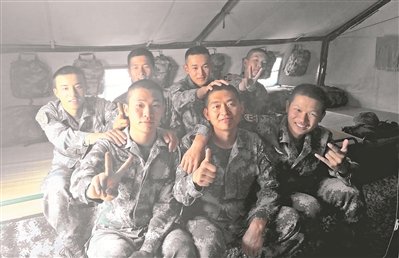 上图:一起顶风冒雪、一起摸爬滚打,如今的苏爱国(前排左二)在战友们眼里不再是贴着研究生标签的那个人,而是普通一兵。 张硕田摄