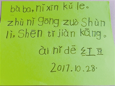 洪斌回到办公室,小心翼翼地拆开信封,取出了一张绿色的信纸。这可能是他有生以来收到过最短的一封信,但也是最令他感动的——信纸上绝大部分内容是用字迹端正的拼音字母写下的:“baba(爸爸),ni xin ku le(你辛苦了)。zhu ni gong zuo shun li(祝你工作顺利),shen ti jian kang(身体健康)。”信的落款是“ai ni de(爱你的)红豆”。