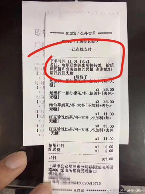 民警四处询问了下,没人下过单,快递小哥连忙递上手中的外卖单,上面写着:麻烦送到派出所接待处,给值班民警和负责监控的民警,谢谢他们帮我找回失物。