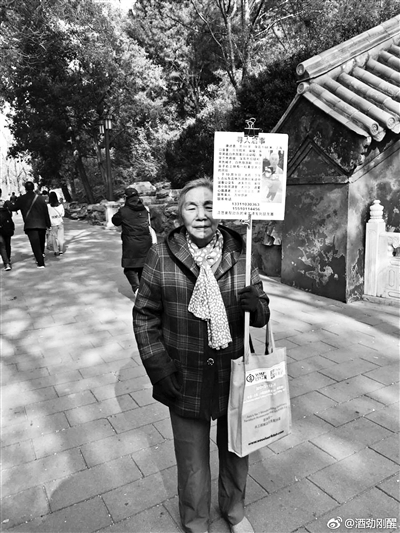 照片中,王爱珍老人穿着一身棉衣,脖子上围着一条天蓝色的围巾,脸上露出焦急的表情,手里举着一块儿白色的牌子,上面写着“寻人启事”。最先将照片发布在网上的网友评论称,看着王奶奶焦急的表情“很心疼”,希望大家可以多帮助她。