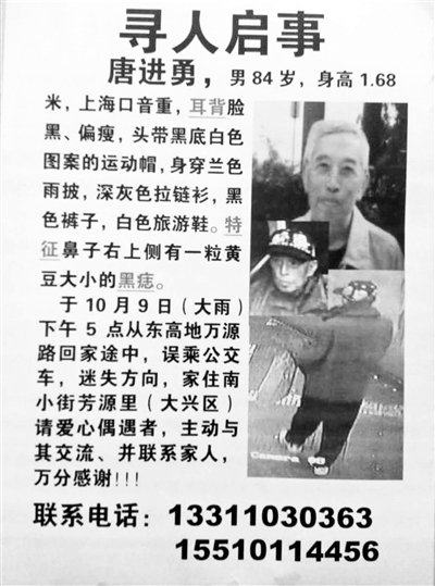 “唐进勇,男,84岁,……请愿意帮助我的乘客发到朋友圈,谢谢!”近日,这则“寻人启事”不停地出现在北京的各个公交车站和公园中。