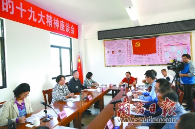 在洞表村公共服务站会议室,来自新兴县、镇、村的党员干部群众代表积极发言,畅谈学习党的十九大精神的心得体会和感受。新兴县委书记唐谊在座谈会上表示,在党的十九大报告中,“三农”是重要问题,新兴作为农业大县,“三农”问题成为首要工作,尤其是在脱贫攻坚上,必须深刻落实十九大精神,在2020年全面建成小康社会;车岗镇委书记伍国强说,镇村党组织继续规范党建工作,多开展支部活动,同时也要大力推进新农村示范点建设项目,把十九大精神扎根基层;洞表村党支部书记覃学潮说,“过去5年是农村大发展的5年,我们将深入贯彻落实党的十九大精神,把洞表村建设得更美好”;车岗镇教育工作者钟学政说,党的十九大让他们深受鼓舞、倍感振奋,希望能实行公平均衡机制,推动城乡义务教育一体化,实现幼有所学目标……